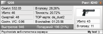 | de_dust2 | 18 | 0 | 1.80 | 0.64 | 2 | 26 | 00:28:08 | 2025-01-22 | |