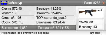 | de_dust2 | 43 | 0 | 1.05 | 0.57 | 4 | 72 | 01:15:13 | 2025-01-25 | |